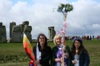 Above, the ladies taking the Maypole around Stonehenge for the blessing